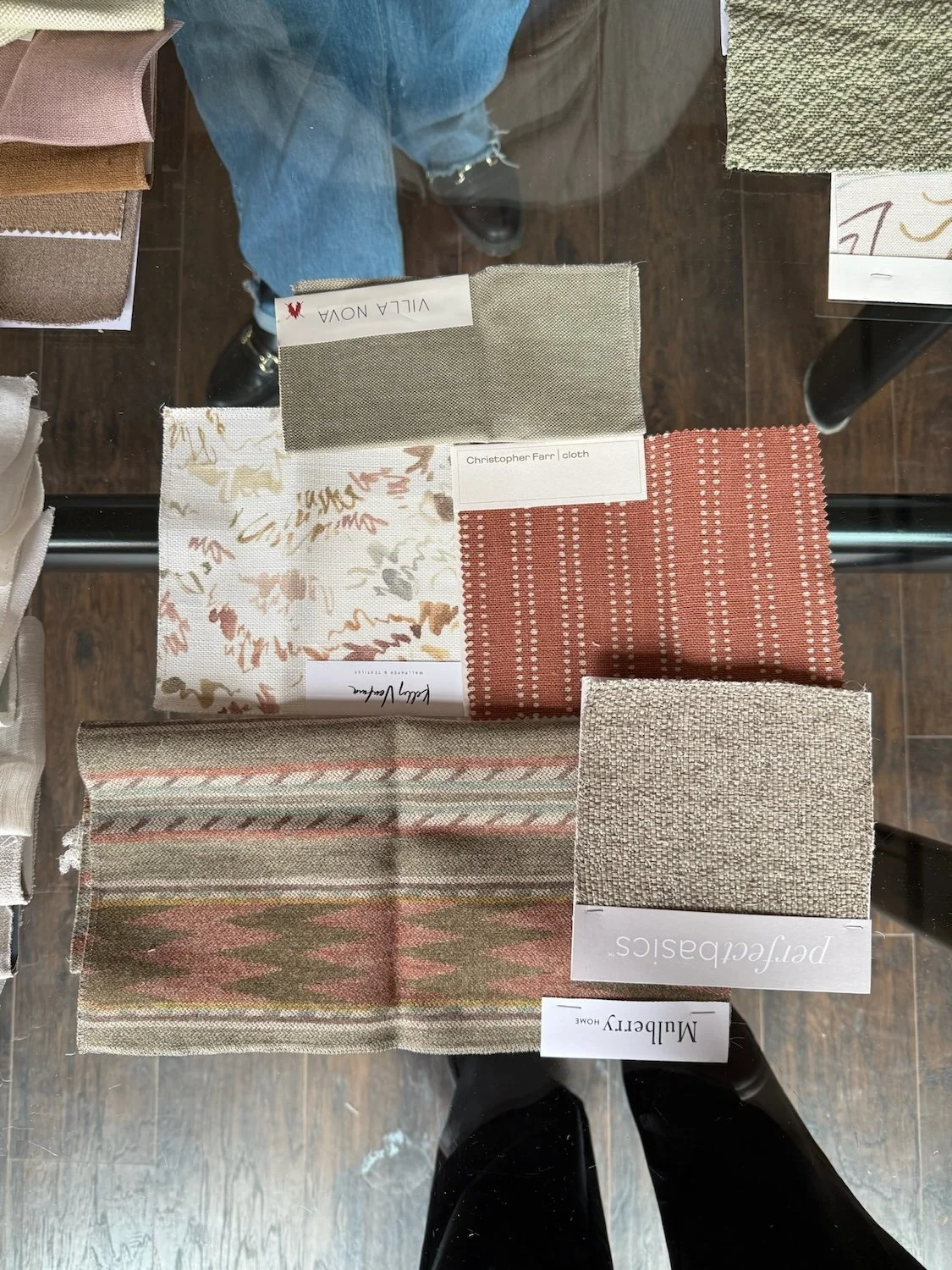 Assorted fabric swatches in earthy tones and patterns, including solids, stripes, and florals, laid out on a glass table for interior design planning.